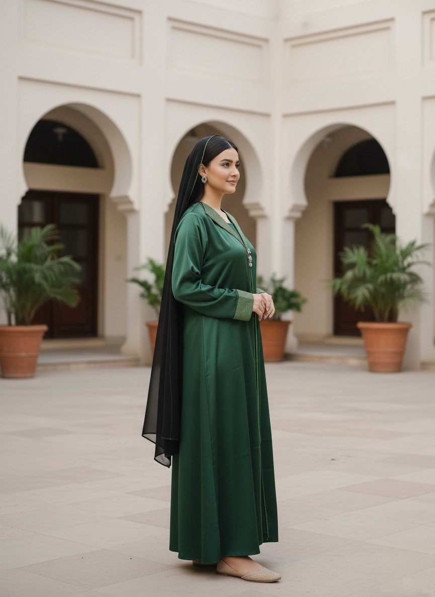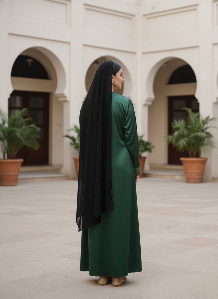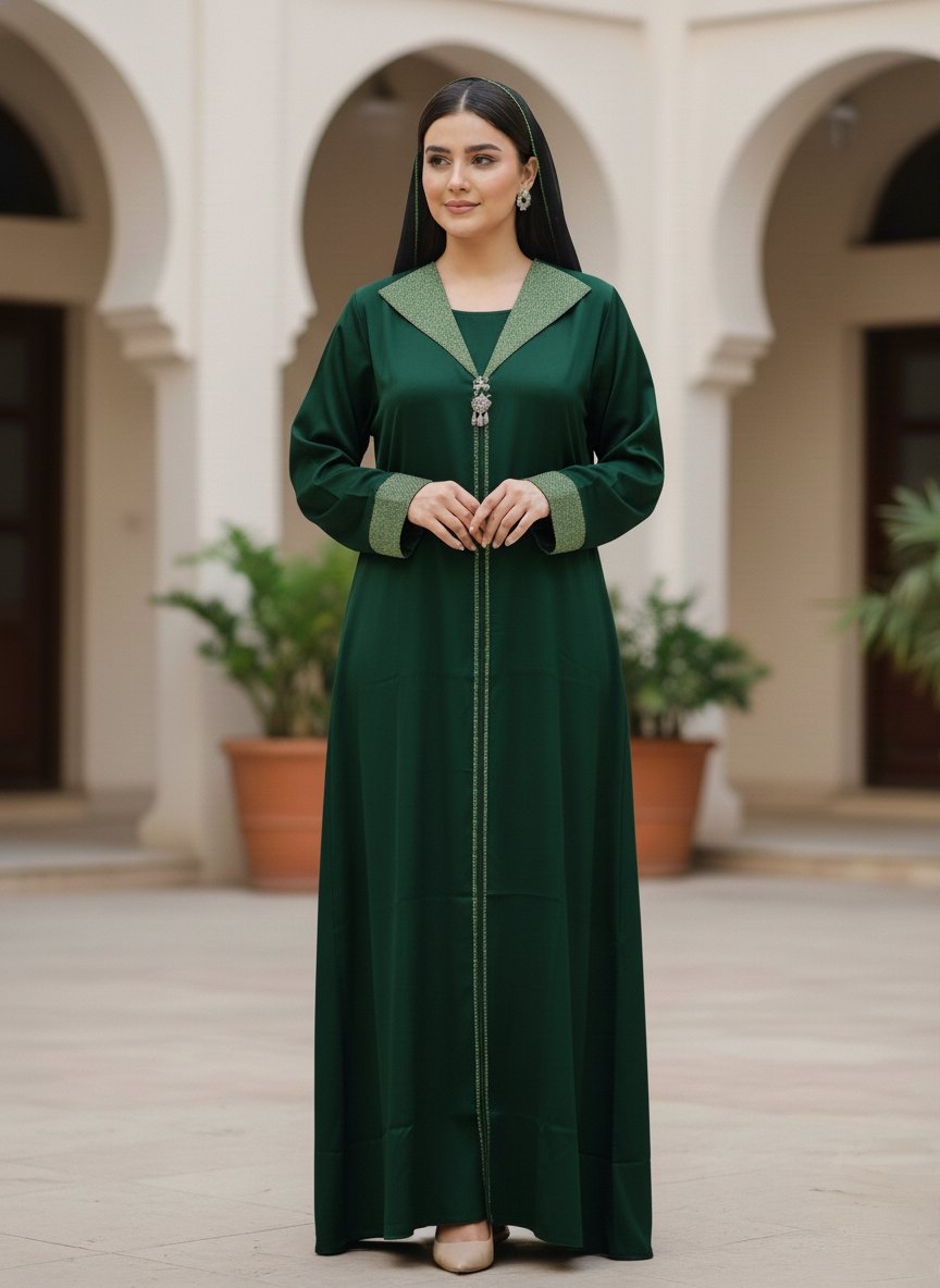 This emerald green abaya is a stylish choice for both casual outings and special occasions. Its timeless color complements various skin tones and can easily be paired with accessories for a customized look. Whether you’re looking for sophisticated attire for religious or cultural events or simply wish to elevate your everyday wardrobe, the Malik Abaya is an ideal option.